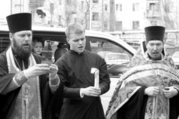 Священнослужители и казаки с крестами, Евангелием, хоругвями, иконами,